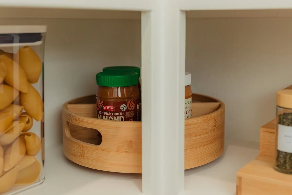 If your pantry has deep corners, a Lazy Susan is a game-changer. It keeps items like oils, sauces, or spices visible and accessible with a simple spin. Lazy Susans also work well for grouping items together and helps you maintain long-term organization.
